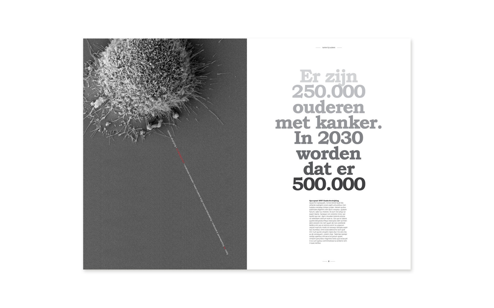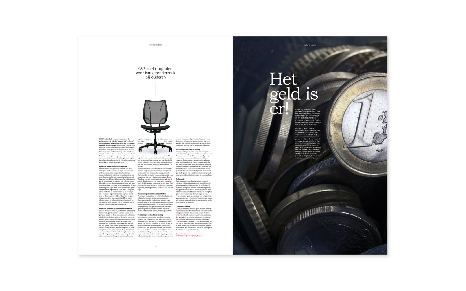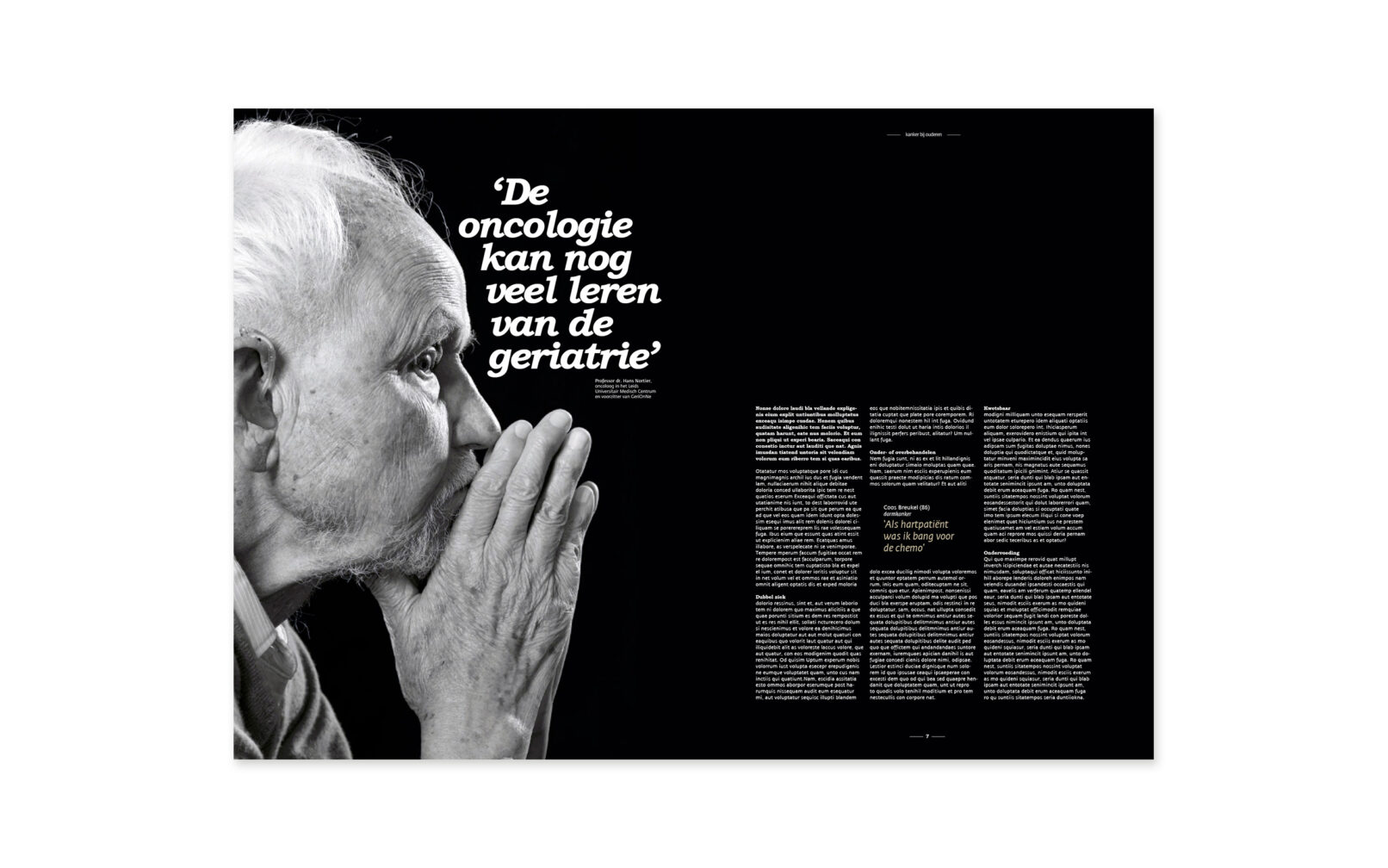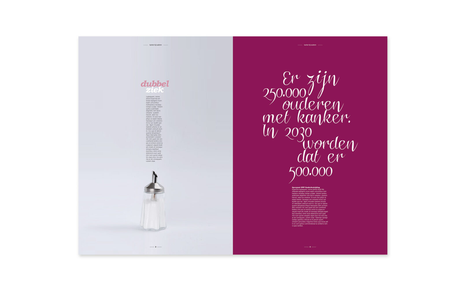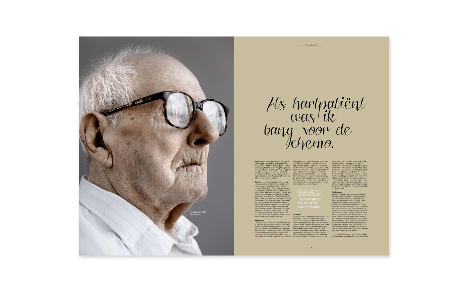 concept KWF Kankerbestrijding vroeg om een printuitgave om het thema ‘kanker bij ouderen’ onder de aandacht te brengen bij mensen, organisaties en beroepsgroepen die iets kunnen betekenen voor ouderen met kanker. Wij kozen voor een opvallende dubbele uitgave met dezelfde onderwerpen, maar verschillende redactionele invalshoek & vorm. De één specifiek gericht op patiënten(organisaties), de andere op wetenschappelijk onderzoek(ers) en onderwijs.